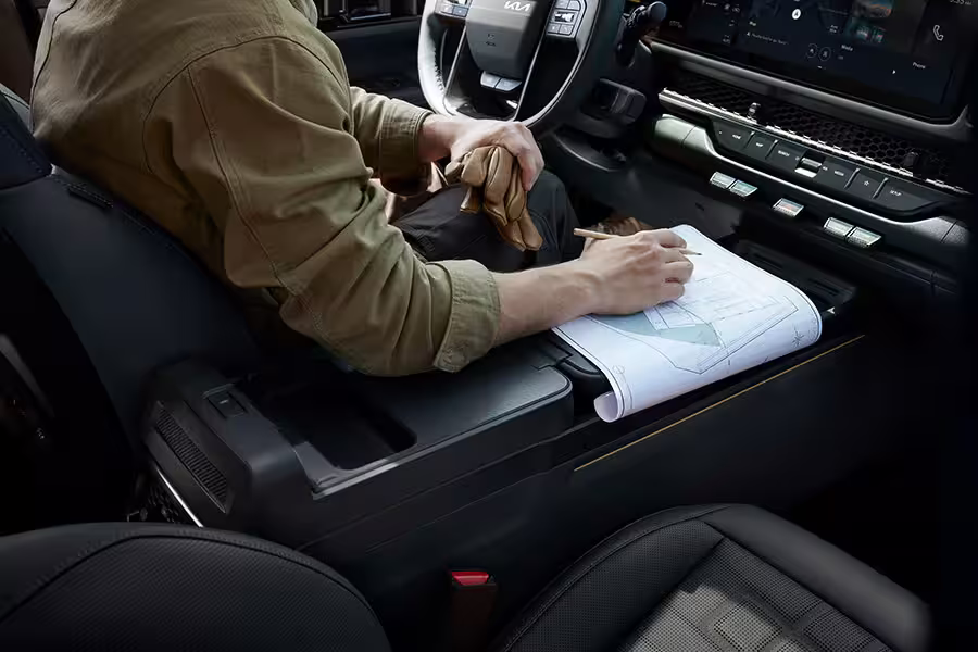 Перетворіть Kia Tasman на мобільний офіс. Центральна консоль розкладається у столик, створюючи зручний простір для ноутбука, документів або навіть легкого перекусу.
